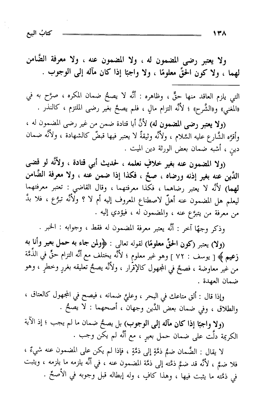 "ولا" يعتبر "كون الحق معلوما" لقوله تعالى: {وَلِمَنْ جَاءَ بِهِ حِمْلُ بَعِيرٍ وَأَنَا بِهِ زَعِيمٌ} [يوسف72] وهو غيرمعلوم لأنه يختلف مع أنه التزام حق في الذمة من غيرمعاوضة فصح في المجهول كالإقرار ولأنه يصح تعليقه بغرر وخطر وهو ضمان العهدة