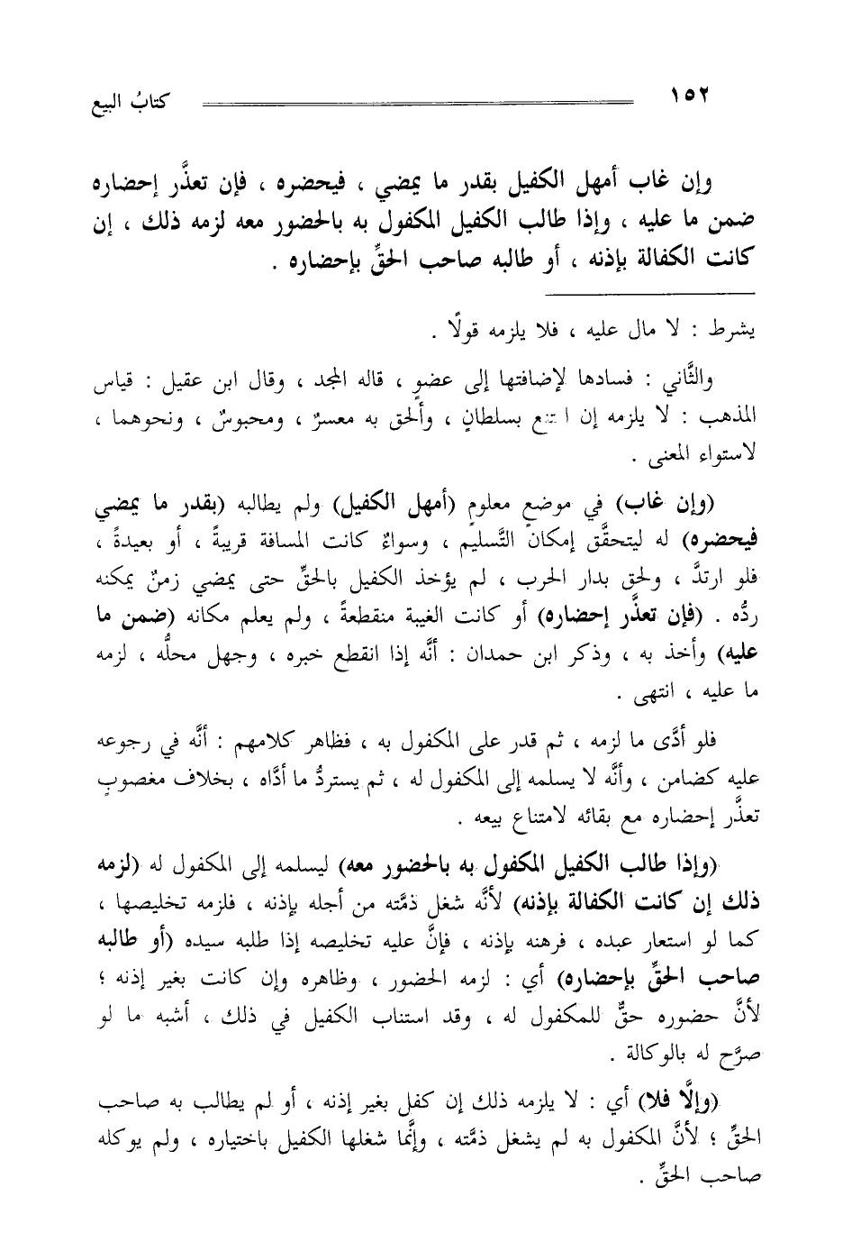 "وإذا طالب الكفيل المكفول به بالحضور معه" ليسلمه إلى المكفول له"لزمه ذلك إن كانت الكفالة بإذنه" لأنه شغل ذمته من أجله بإذنه فلزمه تخليصها كما لو استعار عبده فرهنه بإذنه فإن عليه تخليصه إذا طلبه سيده "أو طالبه صاحب الحق بإحضاره" أي: لزمه الحضور وظاهره: وإن كانت بغير إذنه لأن حضوره حق للمكفول له وقد استناب الكفيل في ذلك أشبه ما لو صرح له بالوكالة
