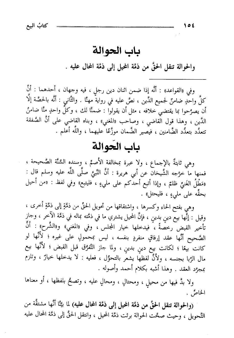 وهي بفتح الحاء وكسرها واشتقاقها من تحويل الحق من ذمة إلى ذمة أخرى وقيل: إنها بيع دين بدين فإن المحيل يشتري ما في ذمته بماله في ذمة الآخر وجاز تأخير القبض رخصة فيدخلها خيار المجلس وفي المغني والشرح أن الصحيح انها عقد إرفاق منفرد بنفسه ليس بمحمول على غيره لأنها لو كانت بيعا لكانت بيع دين بدين ولما جاز التفرق قبل القبض لأنها بيع مال الربا بجنسه ولأن لفظها يشعر بالتحول فعليه لا يدخلها خيار وتلزم بمجرد العقد وهذا أشبه بكلام أحمد وأصوله