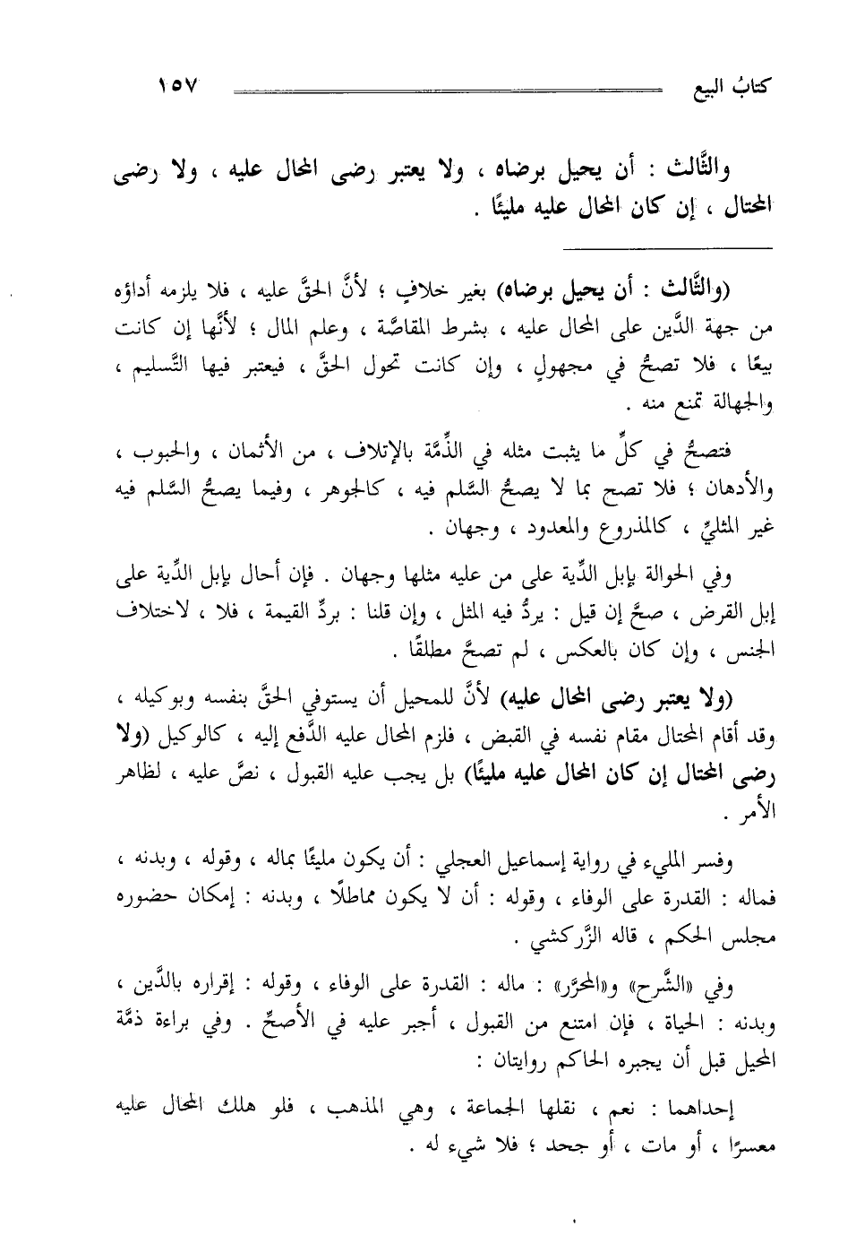"ولا يعتبر رضى المحال عليه" لأن للمحيل أن يستوفي الحق بنفسه وبوكيله وقد أقام المحتال مقام نفسه في القبض فلزم المحال عليه الدفع إليه كالوكيل "ولا رضى المحتال إن كان المحال عليه مليئا" بل يجب عليه القبول نص عليه لظاهر الأمر.