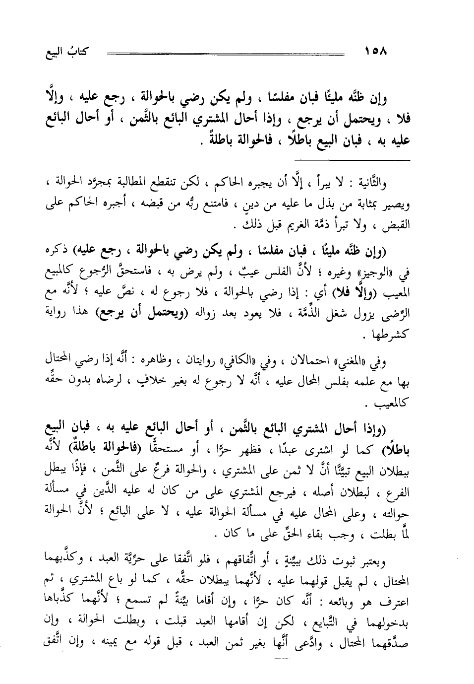 "وإن ظنه مليئا فبان مفلسا ولم يكن رضي بالحوالة رجع عليه" ذكره في الوجيز وغيره لأن الفلس عيب ولم يرض به فاستحق الرجوع كالمبيع المعيب "وإلا فلا" أي: إذا رضي بالحوالة فلا رجوع له نص عليه لأنه مع الرضى يزول شغل الذمة فلا يعود بعد زواله ويحتمل أن يرجع هذا رواية كشرطها.