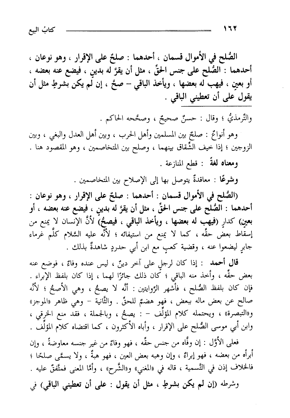 الصلح في الأموال قسمان أحدهما: صلح على الإقرار وهو نوعان أحدهما: الصلح على جنس الحق مثل أن يقر له بدين فيضع عنه بعضه أو بعين فيهب له بعضها ويأخذ الباقي صح إن لم يكن بشرط مثل أن يقول على أن تعطيني الباقي
