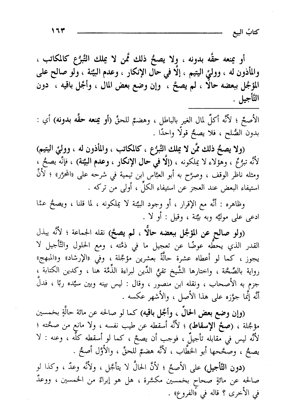 "ولو صالح عن المؤجل ببعضه حالا لم يصح" نقله الجماعة لأنه يبذل القدر الذي يحطه عوضا عن تعجيل ما في ذمته ومع الحلول والتأجيل لا يجوز كما لو أعطاه عشرة حالة بعشرين مؤجلة وفي الإرشاد والمبهج رواية بالصحة واختارها الشيخ تقي الدين لبراءة الذمة هنا وكدين الكتابة جزم به الأصحاب ونقله ابن منصور وقال ليس بينه وبين سيده ربا فدل أنه إنما جوزه على هذا الأصل والأشهر عكسه.