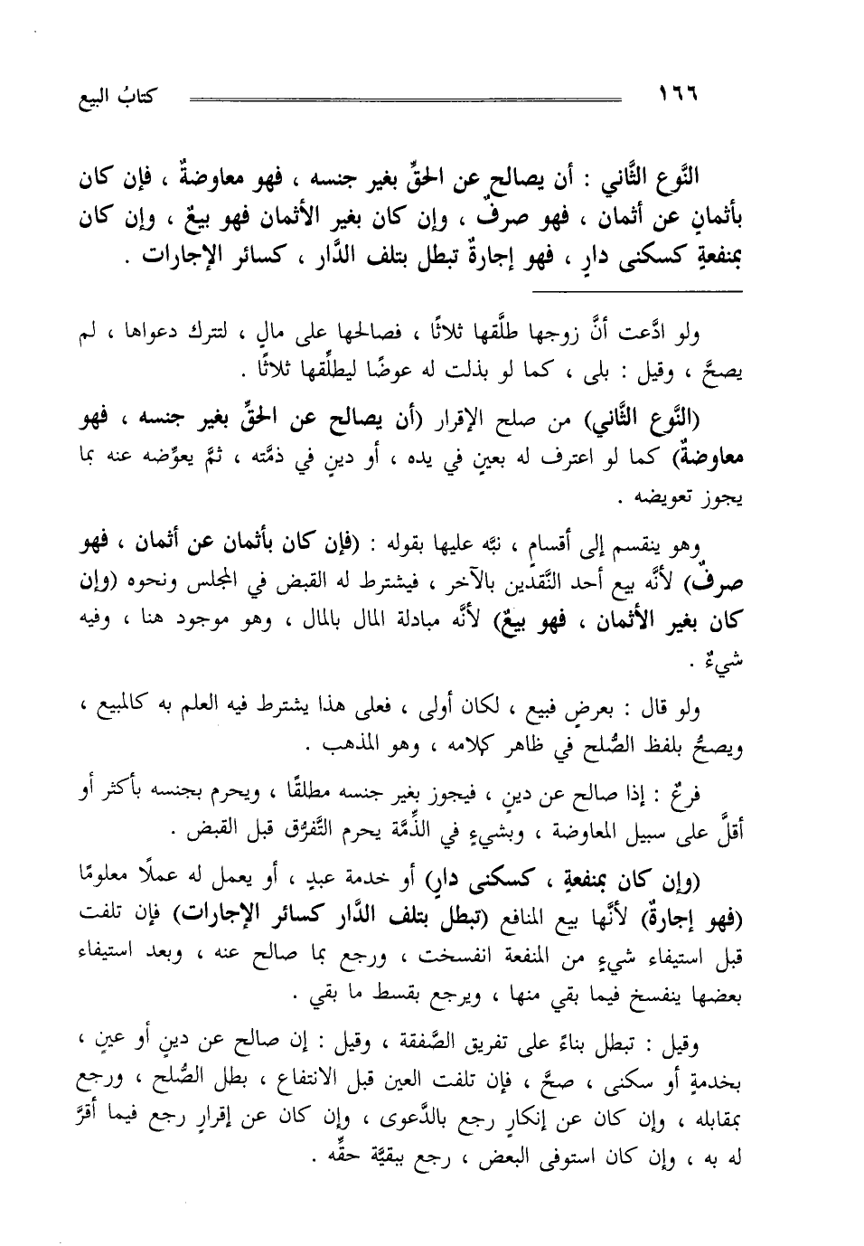 النوع الثاني: أن يصالح عن الحق بغير جنسه فهو معاوضة فإن كان بأثمان عن أثمان فهو صرف وإن كان بغير الأثمان فهو بيع وإن كان بمنفعة كسكنى دار فهو إجارة تبطل بتلف الدار كسائر الإجارات