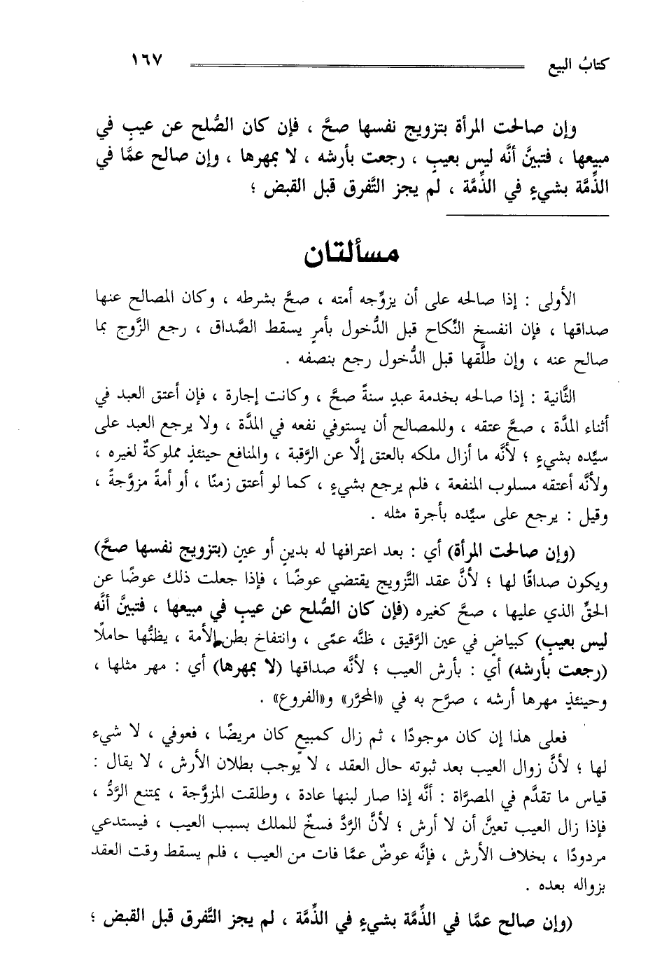 "وإن صالحت المرأة" أي: بعد اعترافها له بدين أو عين "بتزويج نفسها صح" ويكون صداقا لها لأن عقد التزويج يقتضي عوضا فإذا جعلت ذلك عوضا عن الحق الذي عليها صح كغيره "فإن كان الصلح عن عيب في مبيعها فتبين أنه ليس بعيب" كبياض في عين الرقيق ظنه عمى وانتفاخ بطن الأمة يظنها حاملا "رجعت بأرشه" أي: بأرش العيب لأنه صداقها "لا بمهرها" أي: مهر مثلها وحينئذ مهرها أرشه صرح به في المحرر والفروع.