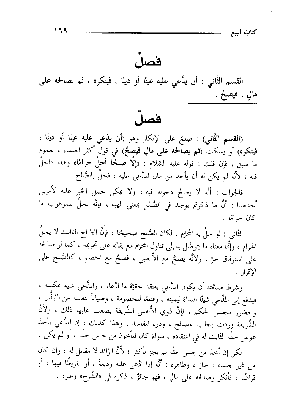 "القسم الثاني" صلح على الإنكار وهو "أن يدعي عليه عينا أو دينا فينكره" أو يسكت "ثم يصالحه على مال فيصح" في قول أكثر العلماء لعموم ما سبق فإن قلت قوله عليه السلام: "إلا صلحا أحل حراما" وهذا داخل فيه لأنه لم يكن له أن يأخذ من مال المدعى عليه فحل بالصلح.