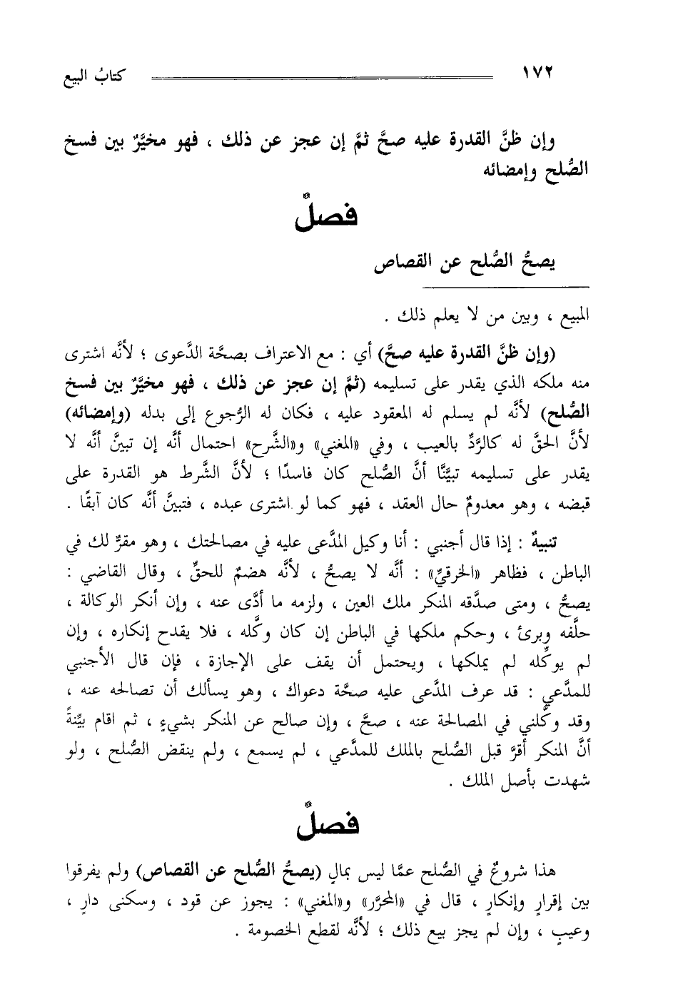 "وإن ظن القدرة عليه صح" أي: مع الاعتراف بصحة الدعوى لأنه اشترى منه ملكه الذي يقدر على تسليمه "ثم إن عجز عن ذلك فهو مخير بين فسخ الصلح" لأنه لم يسلم له المعقود عليه فكان له الرجوع إلى بدله "وإمضائه" لأن الحق له كالرد بالعيب وفي المغني والشرح احتمال أنه إن تبين أنه لا يقدر على تسليمه تبينا أن الصلح كان فاسدا لأن الشرط هو القدرة على قبضه وهو معدوم حال العقد فهو كما لو اشترى عبده فتبين أنه كان آبقا