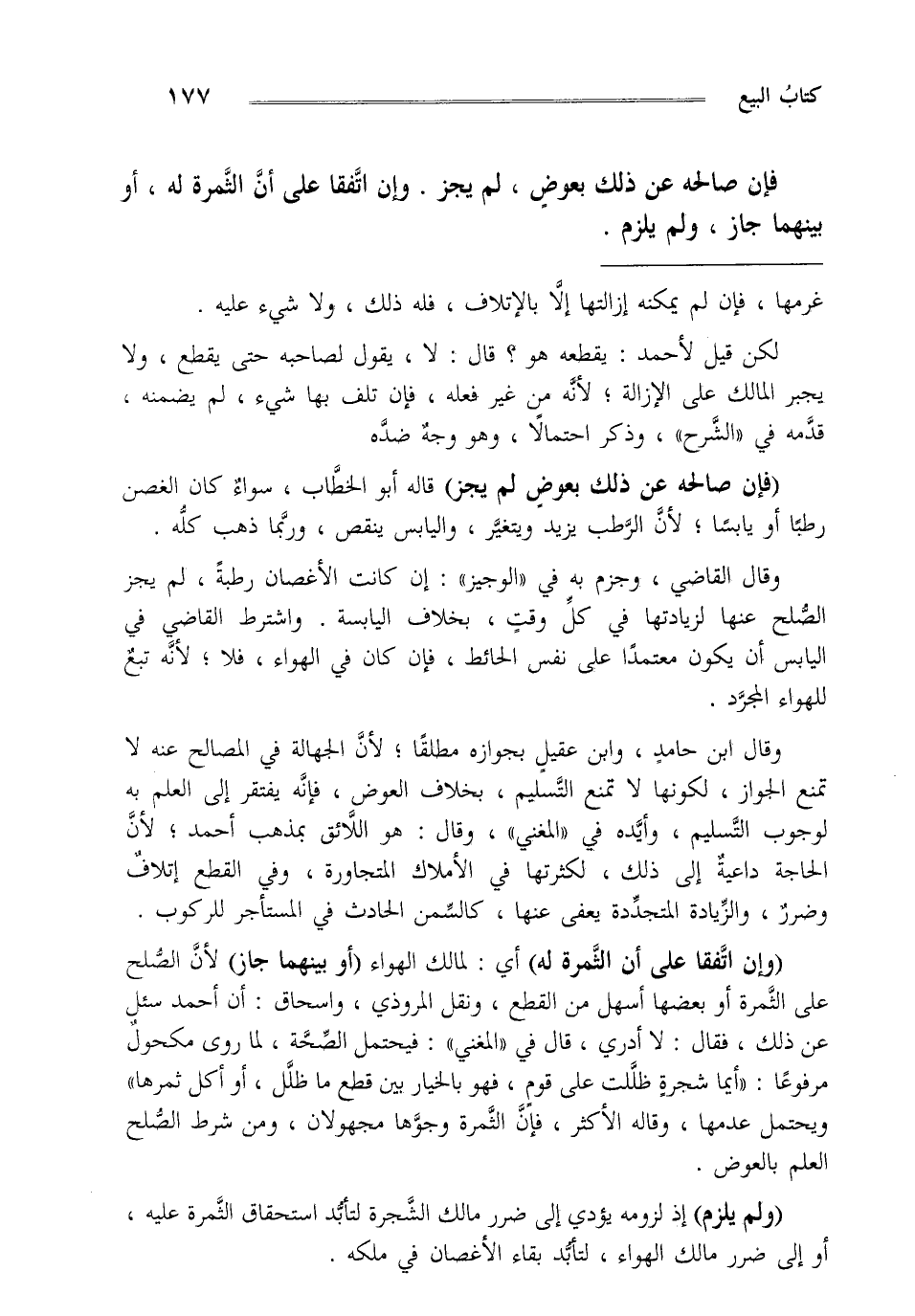 وقال ابن حامد وابن عقيل بجوازه مطلقا لأن الجهالة في المصالح عنه لا تمنع الجواز لكونها لا تمنع التسليم بخلاف العوض فإنه يفتقر إلى العلم به لوجوب التسليم وأيده في المغني وقال هو اللائق بمذهب أحمد لأن الحاجة داعية إلى ذلك لكثرتها في الأملاك المتجاورة وفي القطع إتلاف وضرر والزيادة المتجددة يعفى عنها كالسمن الحادث في المستأجر للركوب. "وإن اتفقا على أن الثمرة له" أي: لمالك الهواء "أو بينهما جاز" لأن الصلح على الثمرة أو بعضها أسهل من القطع ونقل المروذي وإسحاق أن أحمد سئل عن ذلك فقال لا أدري قال في المغني فيحتمل الصحة لما روى مكحول مرفوعا: "أيما شجرة ظللت على قوم فهو بالخيار بين قطع ما ظلل أو أكل ثمرها" ويحتمل عدمها وقاله الأكثر فإن الثمرة وجوها مجهولان ومن شرط الصلح العلم بالعوض