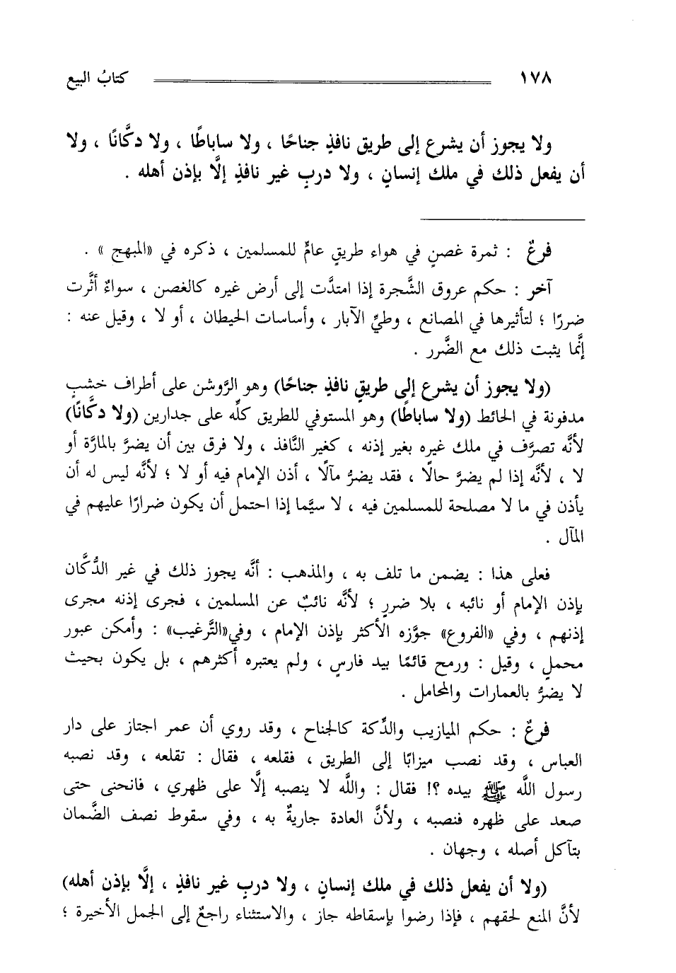 ولا يجوز أن يشرع إلى طريق نافذ جناحا ولا ساباطا ولا دكانا ولا أن يفعل ذلك في ملك إنسان ولادرب غير نافذ إلا بإذن أهله.