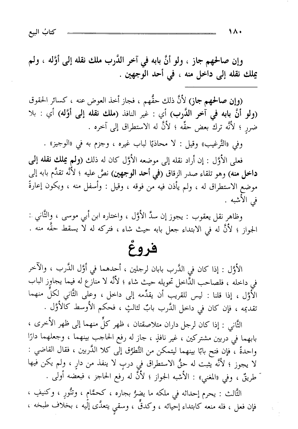 الثاني: إذا كان لرجل داران متلاصقتان ظهر كل منهما إلى ظهر الأخرى بابهما في دربين مشتركين غيرنافذ جاز له رفع الحاجب بينهما وجعلهما دارا واحدة فإن فتح بابا بينهما ليتمكن من التطرق إلى كلا الدربين فقال القاضي لا يجوز لأنه يثبت له حق الاستطراق في درب لا ينفذ من دار ولم يكن فيها طريق وفي المغني الأشبه الجواز لأن له رفع الحاجز فبعضه أولى