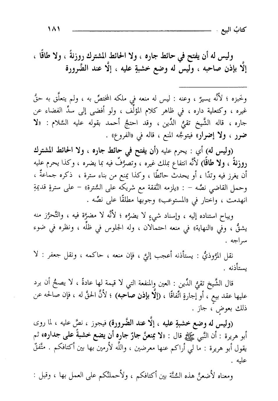 وليس له أن يفتح في حائط جاره ولا الحائط المشترك روزنة ولا طاقا إلا بإذن صاحبه وليس له وضع خشبة عليه إلا عند الضرورة