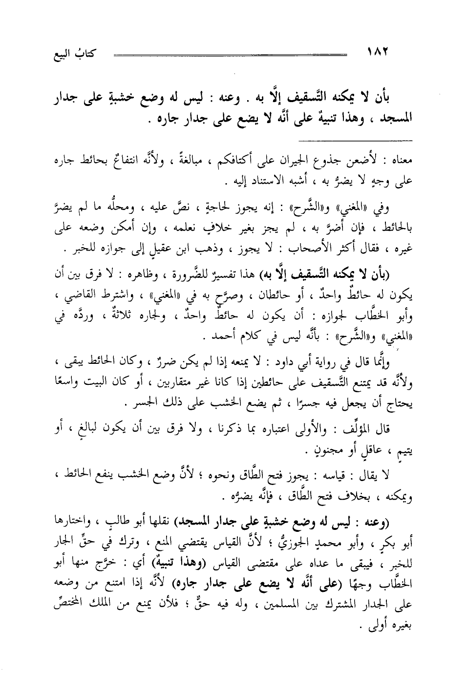 بأن لا يمكنه التسقيف إلا به وعنه: ليس له وضع خشبة على جدار المسجد وهذا تنبيه: على أنه لا يضع على جدار جاره.