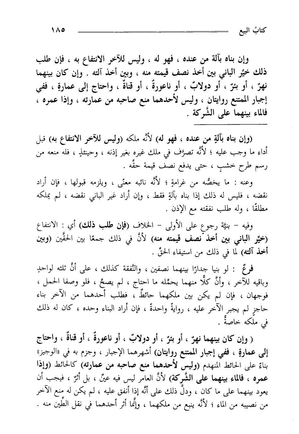 وإن بناه بآلة من عنده فهو له وليس للآخر الانتفاع به فإن طلب ذلك خير الباني بين أخذ نصف قيمته منه وبين أخذ آلته وإن كان بينهما نهر أو بئر أو دولاب أو ناعورة أو قناة واحتاج إلى عمارة ففي إجبار الممتنع روايتان وليس لأحدهما منع صاحبه من عمارته وإذا عمره فالماء بينهما على الشركة.