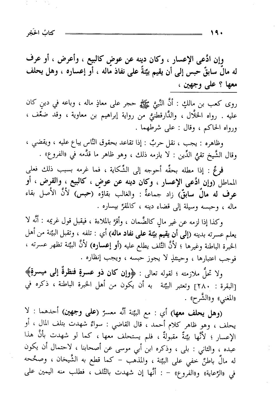 وإن ادعى الإعسار وكان دينه عن عوض كالبيع وأعرض أو عرف له مال سابق حبس إلى أن يقيم بينة على نفاذ ماله أو إعساره وهل يحلف معها على وجهين،