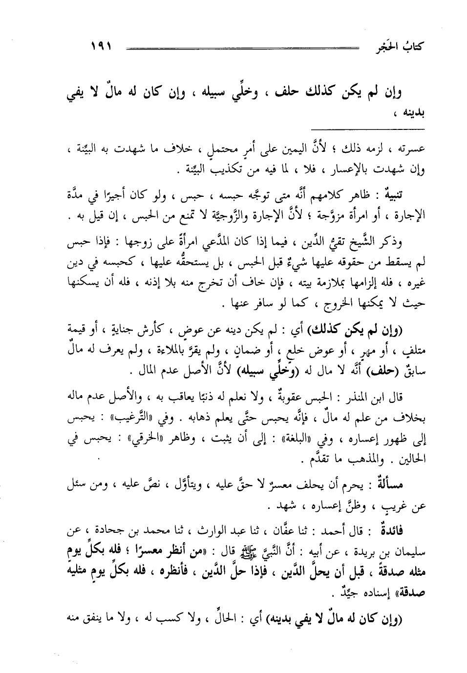 قال ابن المنذر: الحبس عقوبة ولا نعلم له ذنبا يعاقب به والأصل عدم ماله بخلاف من علم له مال فإنه يحبس حتى يعلم ذهابه وفي الترغيب يحبس إلى ظهور إعساره وفي البلغة إلى أن يثبت وظاهر الخرقي يحبس في الحالين والمذهب ما تقدم.