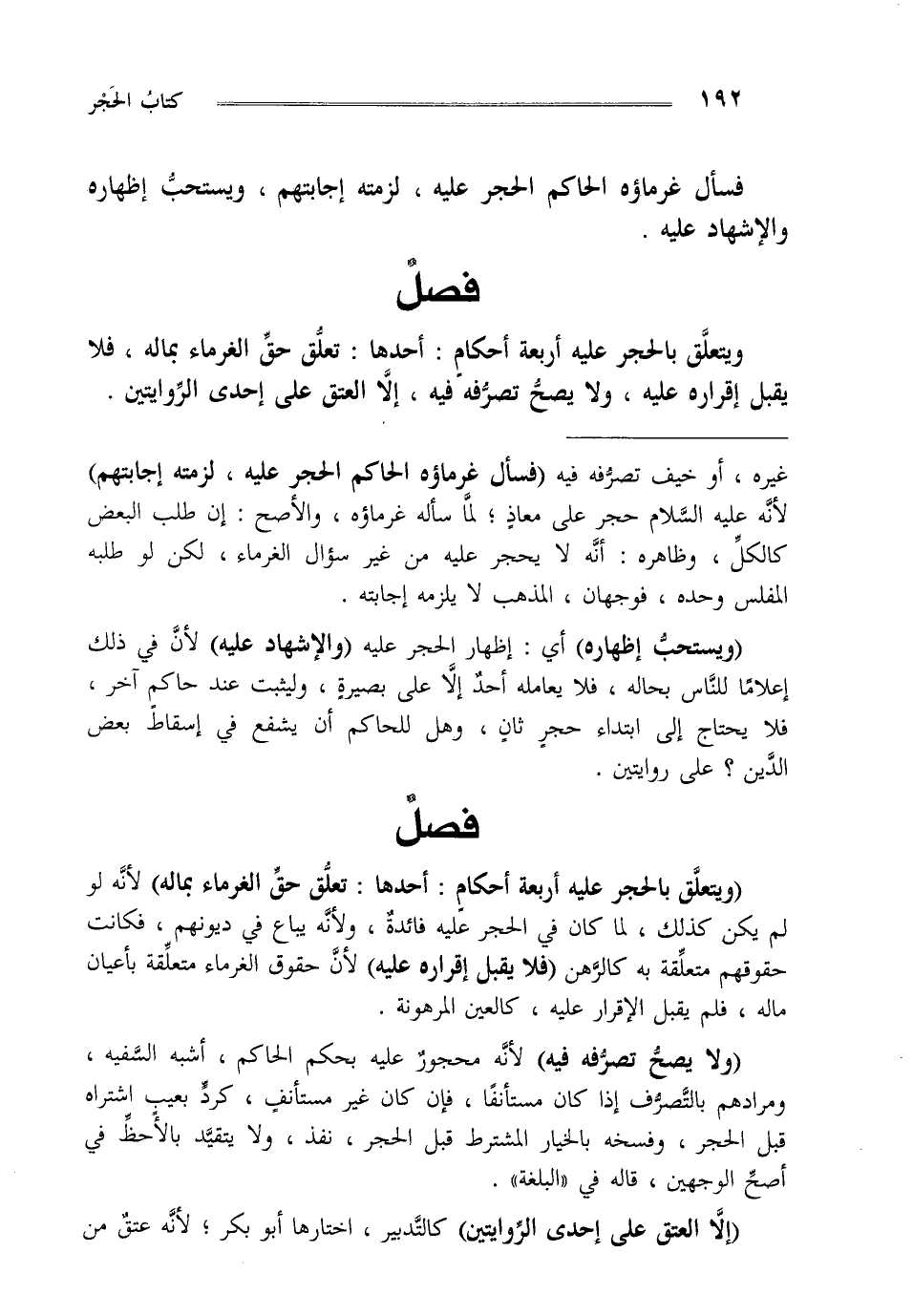"ويتعلق بالحجر عليه أربعة أحكام أحدها تعلق حق الغرماء بماله" لأنه لو لم يكن كذلك لما كان في الحجر عليه فائدة ولأنه يباع في ديونهم فكانت حقوقهم متعلقة به كالرهن "فلا يقبل إقراره عليه" لأن حقوق الغرماء متعلقة بأعيان ماله فلم يقبل الإقرار عليه كالعين المرهونة