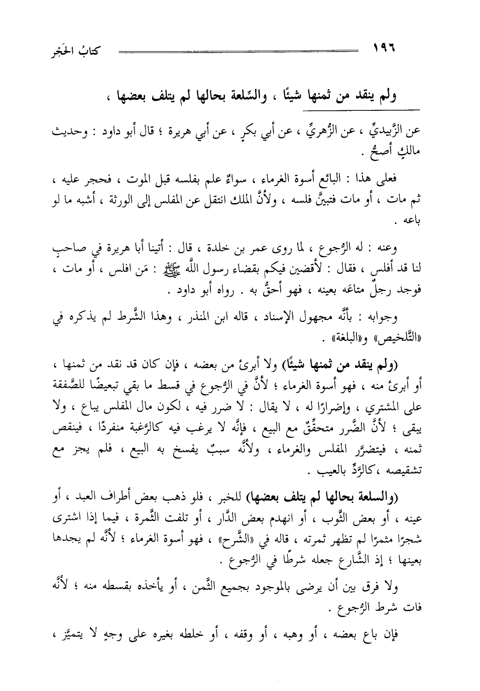 "والسلعة بحالها لم يتلف بعضها" للخبر فلو ذهب بعض أطراف العبد أو عينه أو بعض الثوب أو انهدم بعض الدار أو تلفت الثمرة فيما إذا اشترى شجرا مثمرا لم تظهر ثمرته قاله في والشرح فهو اسوة الغرماء لأنه لم يجدها بعينها إذ الشارع جعله شرطا في الرجوع