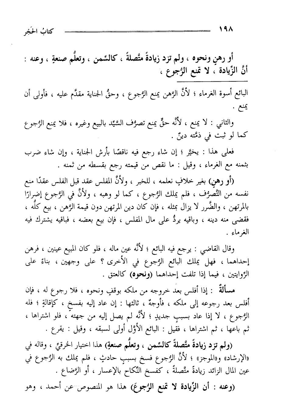 "ولم تزد زيادة متصلة كالسمن وتعلم صنعة" هذا اختيار الخرقي وقاله في الإرشاد والموجز لأن الرجوع فسخ بسبب حادث فلم يملك به الرجوع في عين المال الزائد زيادة متصلة كفسخ النكاح بالإعسار أو الرضاع