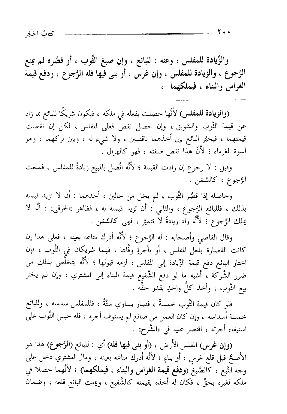 وحاصله إذا قصر الثوب لم يخل من حالين أحدهما أن لا تزيد قيمته بذلك فللبائع الرجوع والثاني: أن تزيد قيمته به فظاهر الخرقي أنه لا يملك الرجوع لأنه زاد زيادة لا تتميز فهي كالسمن