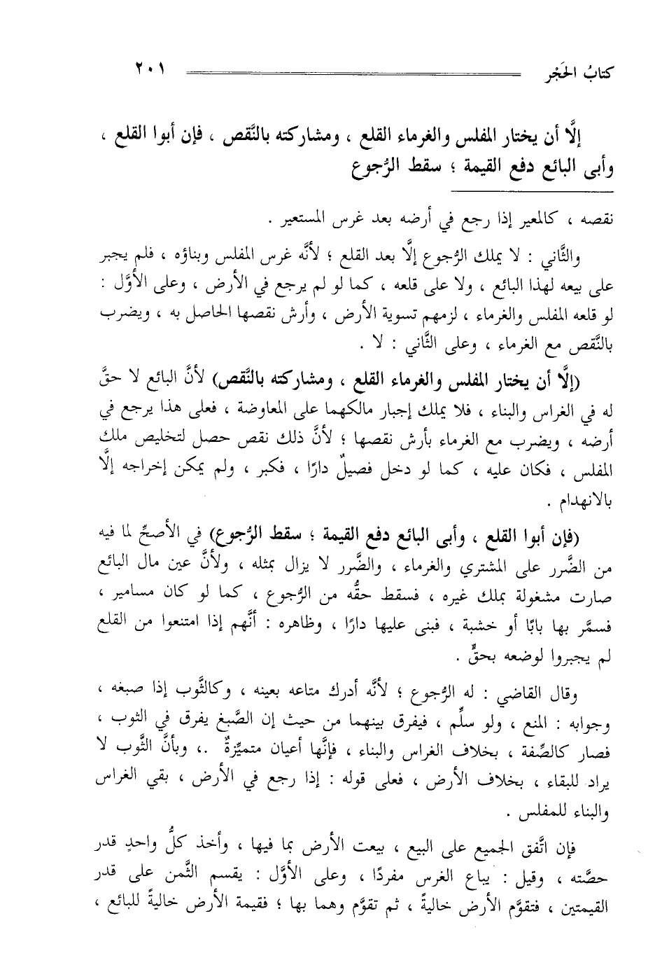 "إلا أن يختار المفلس والغرماء القلع ومشاركته بالنقص" لأن البائع لا حق له في الغراس والبناء فلا يملك إجبار مالكهما على المعاوضة فعلى هذا يرجع في أرضه ويضرب مع الغرماء بأرش نقصها لأن ذلك نقص حصل لتخليص ملك المفلس فكان عليه كما لو دخل فصيل دارا فكبر ولم يمكن إخراجه إلا بالانهدام