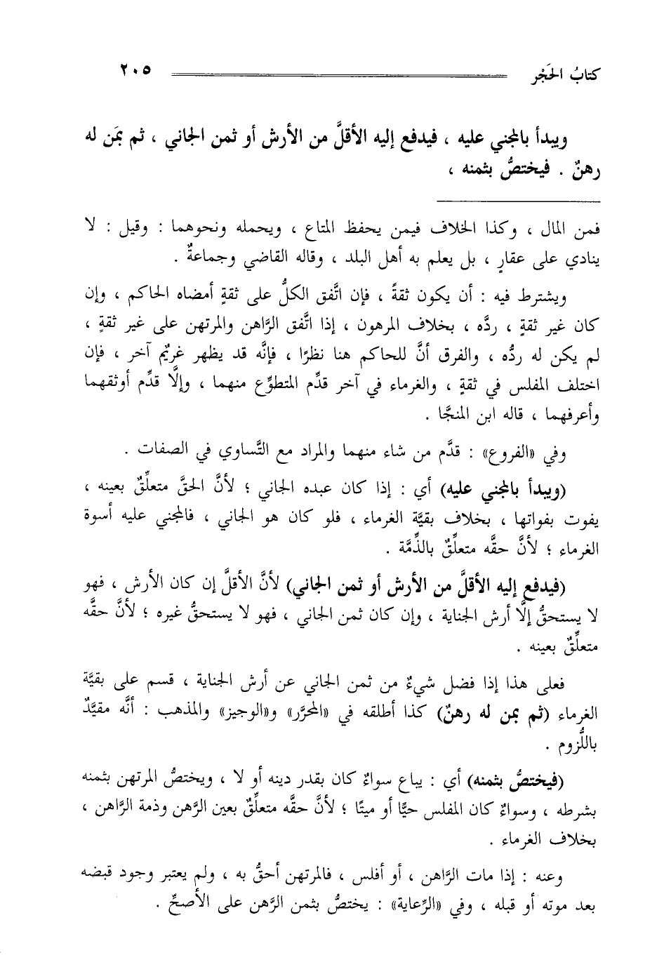 "ويبدأ بالمجني عليه" أي: إذا كان عبده الجاني لأن الحق متعلق بعينه يفوت بفواتها بخلاف بقية الغرماء فلو كان هو الجاني فالمجني عليه أسوة الغرماء لأن حقه متعلق بالذمة فيدفع إليه الأقل من الأرش أو ثمن الجاني لأن الأقل إن كان الأرش فهو لا يستحق إلا أرش الجناية وإن كان ثمن الجاني فهو لا يستحق غيره لأن حقه متعلق بعينه
