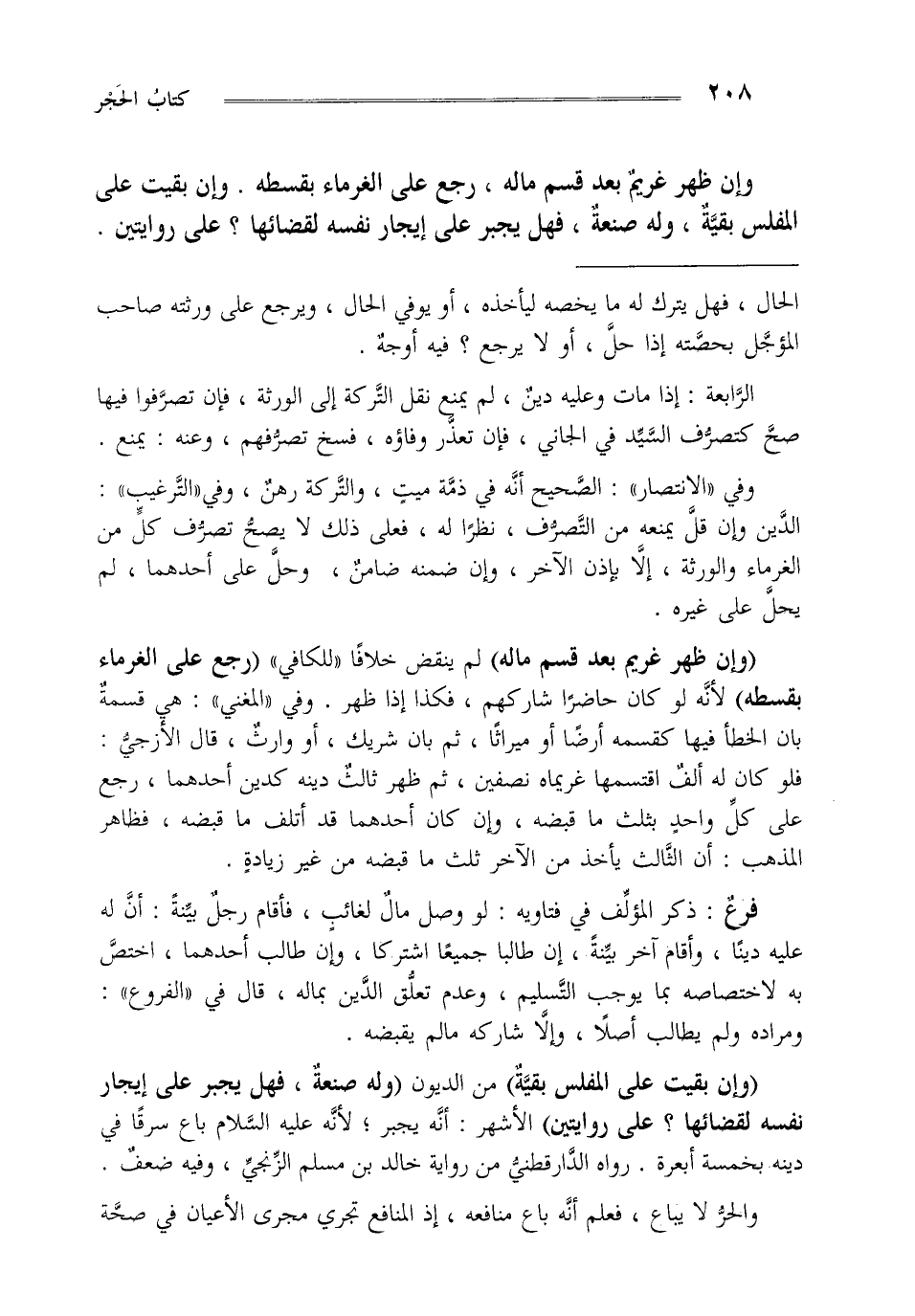 "وإن بقيت على المفلس بقية" من الديون "وله صنعة فهل يجبر على إيجار نفسه لقضائها؟ على روايتين" الأشهر أنه يجبر لأنه عليه السلام باع سرقا في دينه القدرة أبعرة رواه الدارقطني من رواية خالد بن مسلم الزنجي وفيه ضعف