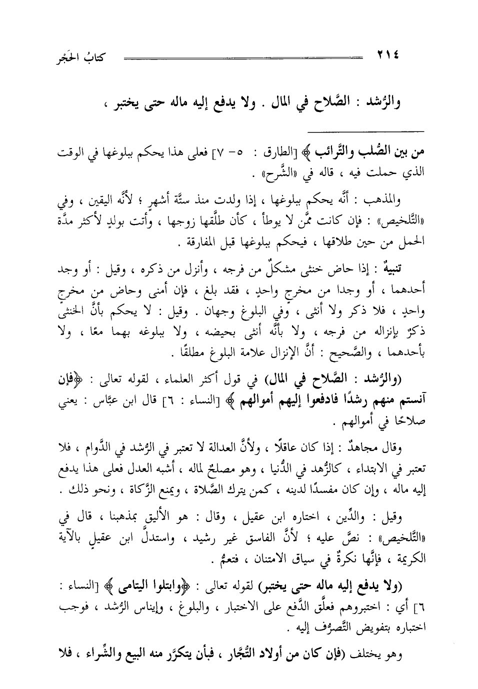 "والرشد: الصلاح في المال" في قول أكثر العلماء لقوله تعالى: {فَإِنْ آنَسْتُمْ مِنْهُمْ رُشْداً فَادْفَعُوا إِلَيْهِمْ أَمْوَالَهُمْ } [النساء:6] قال ابن عباس: يعني صلاحا في أموالهم