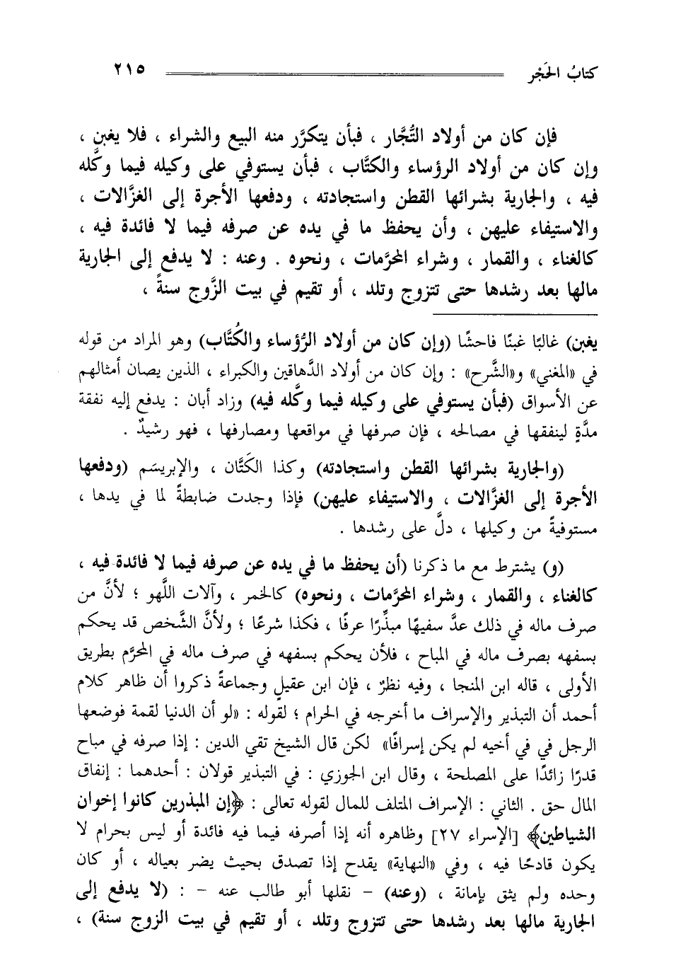 "و" يشترط مع ما ذكرنا "أن يحفظ ما في يده عن صرفه فيما لا فائدة فيه كالغناء والقمار وشراء المحرمات ونحوه" كالخمر وآلات اللهو لأن من صرف ماله في ذلك عد سفيها مبذرا عرفا فكذا شرعا ولأن الشخص قد يحكم بسفهه بصرف ماله في المباح فلأن يحكم بسفهه في صرف ماله في المحرم بطريق الأولى: قاله ابن المنجا وفيه نظر فإن ابن عقيل وجماعة ذكروا أن ظاهر كلام أحمد أن التبذير والإسراف ما أخرجه في الحرام لقوله لو أن الدنيا لقمة فوضعها الرجل في في أخيه لم يكن إسرافا لكن قال الشيخ تقي الدين إذا أصرفه في مباح قدرا زائدا على المصلحة وقال ابن الجوزي في التبذير قولان أحدهما: إنفاق المال حق الثاني: الإسراف المتلف للمال لقوله تعالى: {إِنَّ الْمُبَذِّرِينَ كَانُوا إِخْوَانَ الشَّيَاطِينِ} الإسراء وظاهره: أنه إذا أصرفه فيما فيه فائدة أو ليس بحرام لا يكون قادحا فيه وفي النهاية يقدح إذا تصدق بحيث يضر بعياله أو كان وحده ولم يثق بإمانة "وعنه" نقلها أبو طالب عنه "لا يدفع إلى الجارية مالها بعد رشدها حتى تتزوج وتلد أو تقيم في بيت الزوج سنة"،