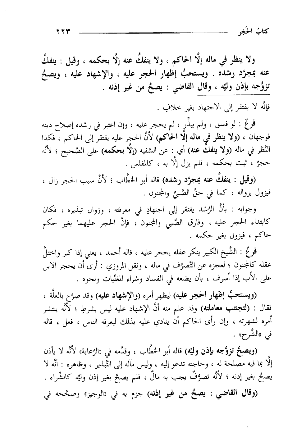 ولا ينظر في ماله إلا الحاكم ولا ينفك عنه إلا بحكمه وقيل: ينفك عنه بمجرد رشده ويستحب إظهار الحجر عليه والإشهاد عليه ويصح تزوجه بإذن وليه وقال القاضي: يصح من غيرإذنه،