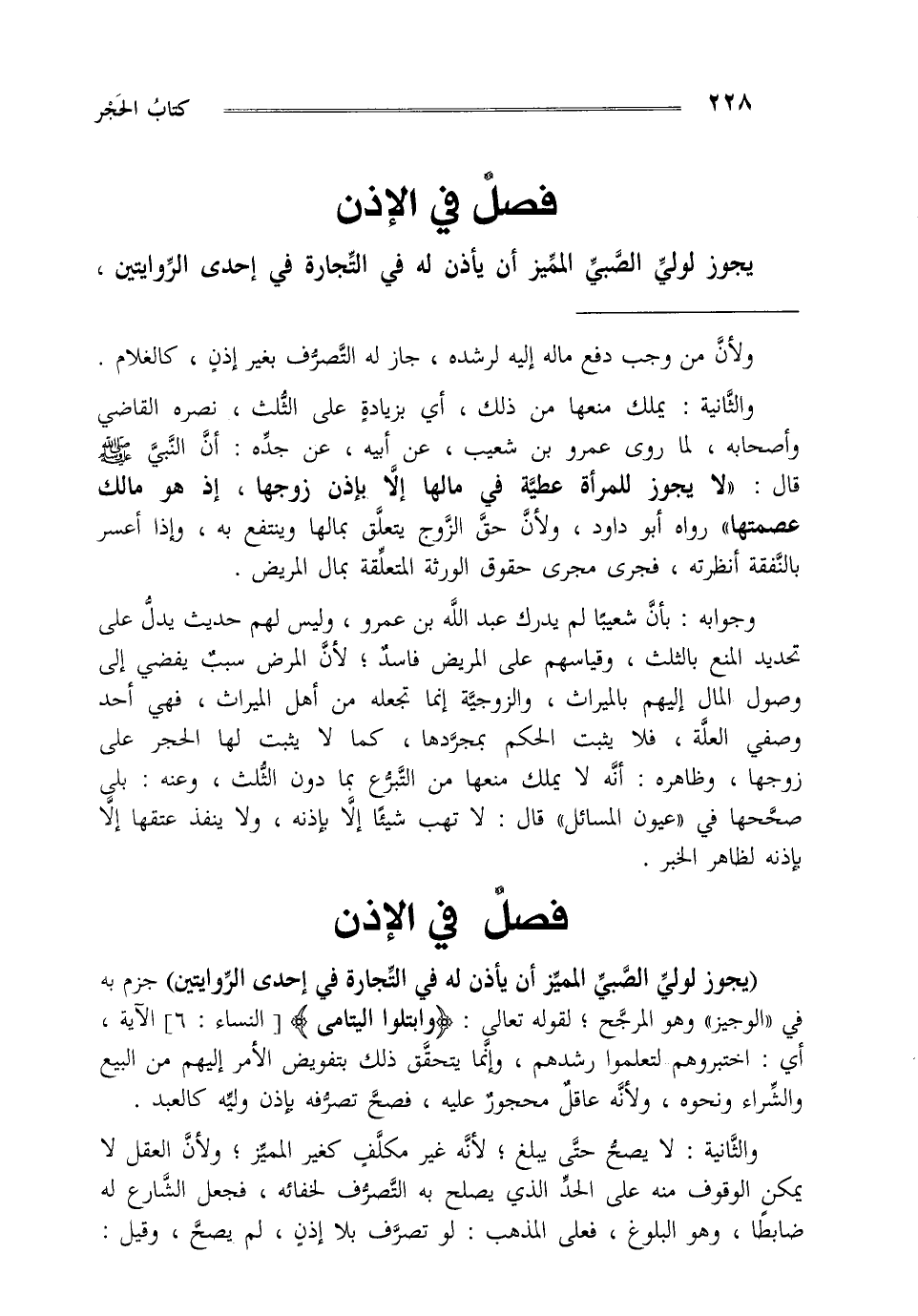 "يجوز لولي الصبي المميز أن يأذن له في التجارة في إحدى الروايتين" جزم به في الوجيز وهو المرجح لقوله تعالى: {وَابْتَلُوا الْيَتَامَى} [النساء:6] الآية أي: اختبروهم لتعلموا رشدهم وإنما يتحقق ذلك بتفويض الأمر إليهم من البيع والشراء ونحوه ولأنه عاقل محجور عليه فصح تصرفه بإذن وليه كالعبد