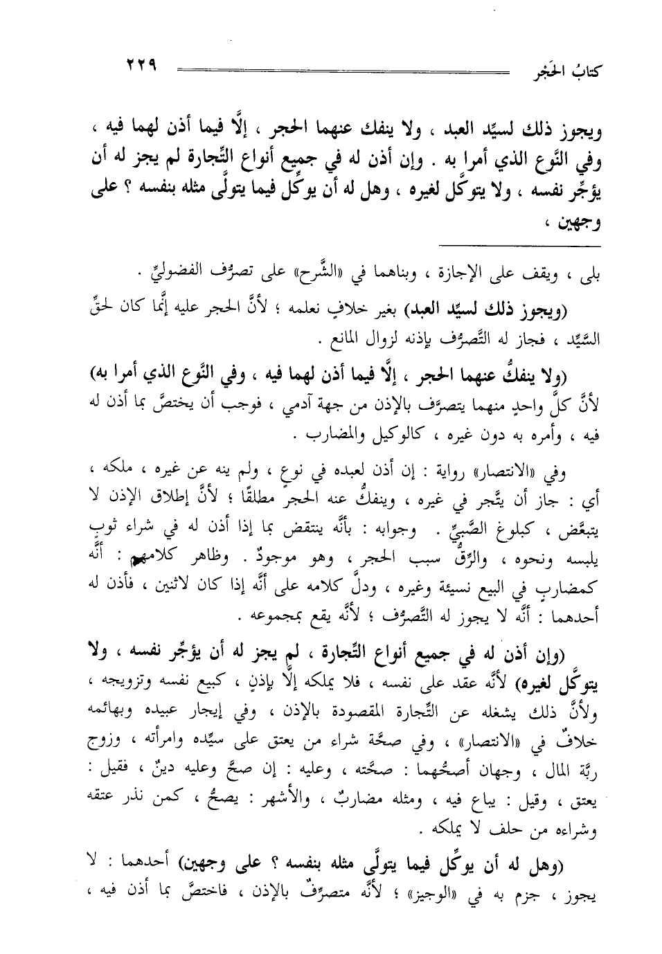 "ولا ينفك عنهما الحجر إلا فيما أذن لهما فيه وفي النوع الذي أمرا به" لأن كل واحد منهما يتصرف بالإذن من جهة آدمي فوجب أن يختص بما أذن له فيه وأمره به دون غيره كالوكيل والمضارب