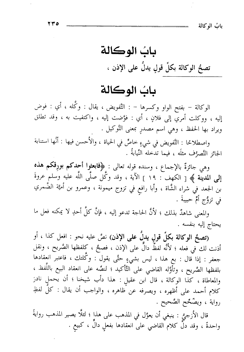 والمعنى شاهد بذلك لأن الحاجة تدعو إليه فإن كل أحد لا يمكنه فعل ما يحتاج إليه بنفسه. "تصح الوكالة بكل قول يدل على الإذن" نص عليه نحو افعل كذا أو أذنت لك في فعله لأنه لفظ دال على الإذن فصح كلفظها الصريح ونقل جعفر إذا قال بع هذا ليس بشيء حتى يقول وكلتك فاعتبر انعقادها بلفظها الصريح وتأوله القاضي على التأكيد لنصه على انعقاد البيع باللفظ والمعاطاة كذا الوكالة قال ابن عقيل هذا دأب شيخنا أن يحمل نادر كلام أحمد على أظهره ويصرفه عن ظاهره والواجب أن يقال كل لفظ رواية ويصحح الصحيح.
