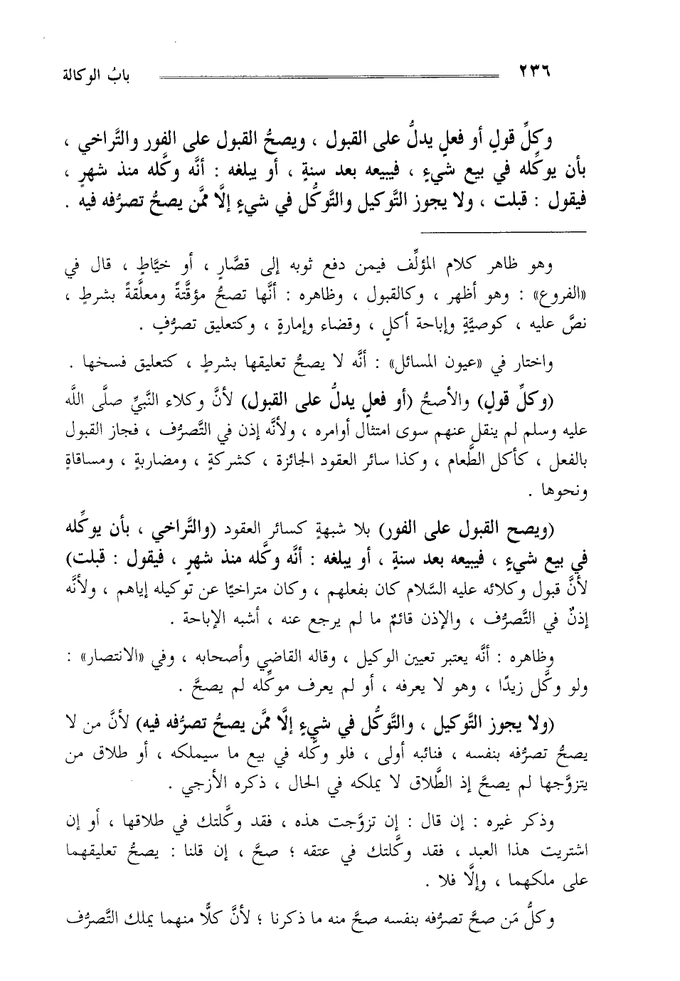 "ويصح القبول على الفور" بلا شبهة كسائر العقود "والتراخي بأن يوكله في بيع شيء فيبيعه بعد سنة أو يبلغه أنه وكله منذ شهر فيقول قبلت" لأن قبول وكلائه عليه السلام كان بفعلهم وكان متراخيا عن توكله اياهم ولأنه إذن في التصرف والإذن قائم ما لم يرجع عنه أشبه الإباحة.