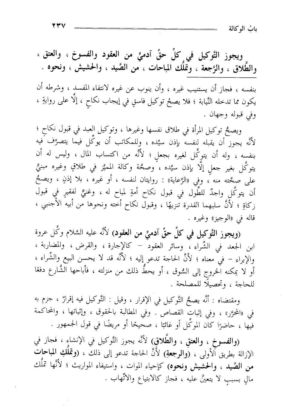 ويجوز التوكيل في كل حق آدمي من العقود والفسوخ والعتق والطلاق والرجعة وتملك المباحات من الصيد والحشيش ونحوه،