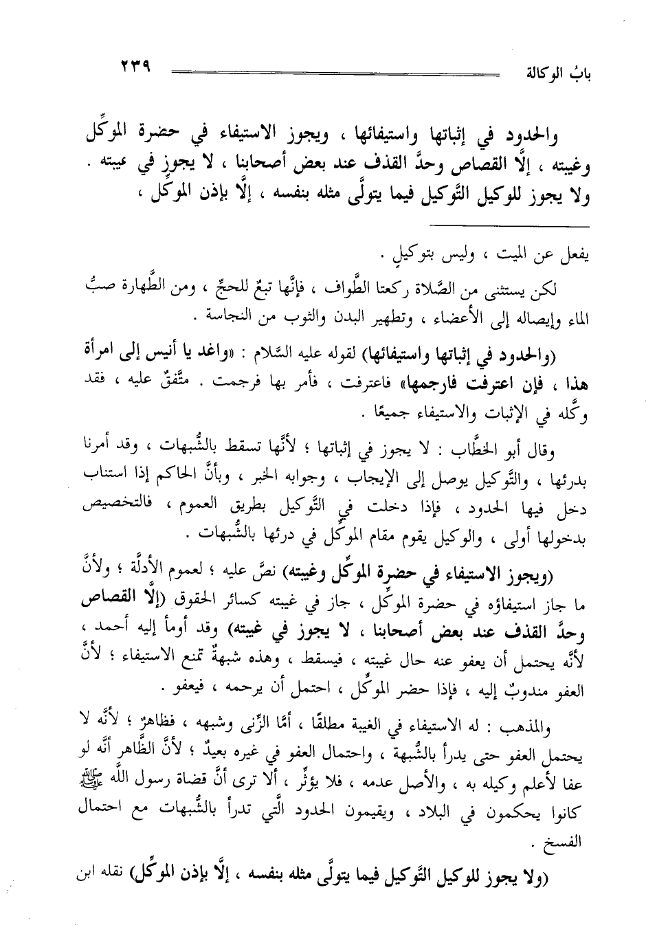وقال أبو الخطاب: لا يجوز في إثباتها لأنها تسقط بالشبهات وقد أمرنا بدرئها والتوكيل يوصل إلى الإيجاب وجوابه الخبر وبأن الحاكم إذا استناب دخل فيها الحدود فإذا دخلت في التوكيل بطريق العموم فالتخصيص بدخولها أولى والوكيل يقوم مقام الموكل في درئها بالشبهات