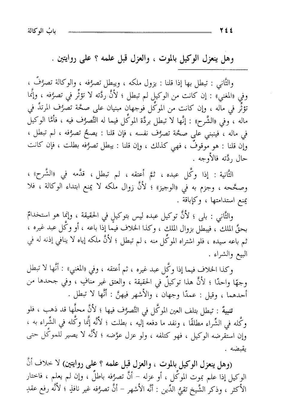 "وهل ينعزل الوكيل بالموت والعزل قبل علمه؟ على روايتين" لا خلاف أن الوكيل إذا علم بموت الموكل أو عزله ان تصرفه باطل وإن لم يعلم فاختار الأكثر وذكر الشيخ تقي الدين أنه الأشهر أن تصرفه غيرنافذ لأنه رفع عقد