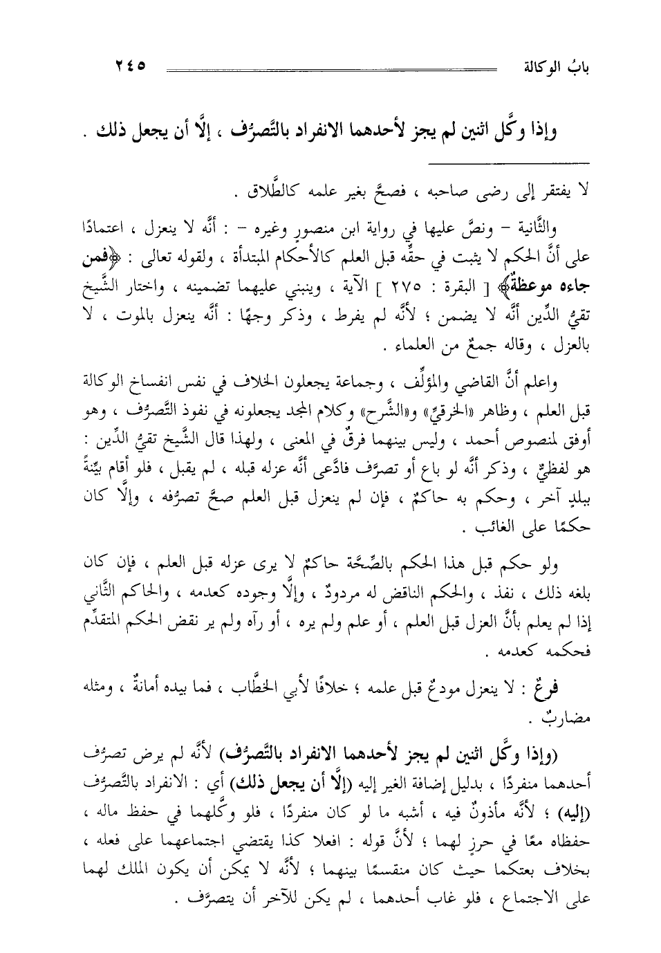 "وإذا وكل اثنين لم يجز لأحدهما الانفراد بالتصرف" لأنه لم يرض تصرف أحدهما منفردا بدليل إضافة الغير إليه "إلا أن يجعل ذلك" أي: الانفراد بالتصرف إليه لأنه مأذون فيه أشبه ما لو كان منفردا فلو وكلهما في حفظ ماله حفظاه معا في حرز لهما لأن قوله افعلا كذا يقتضي اجتماعهما على فعله بخلاف بعتكما حيث كان منقسما بينهما لأنه لا يمكن أن يكون الملك لهما على الاجتماع فلو غاب أحدهما لم يكن للآخر أن يتصرف.