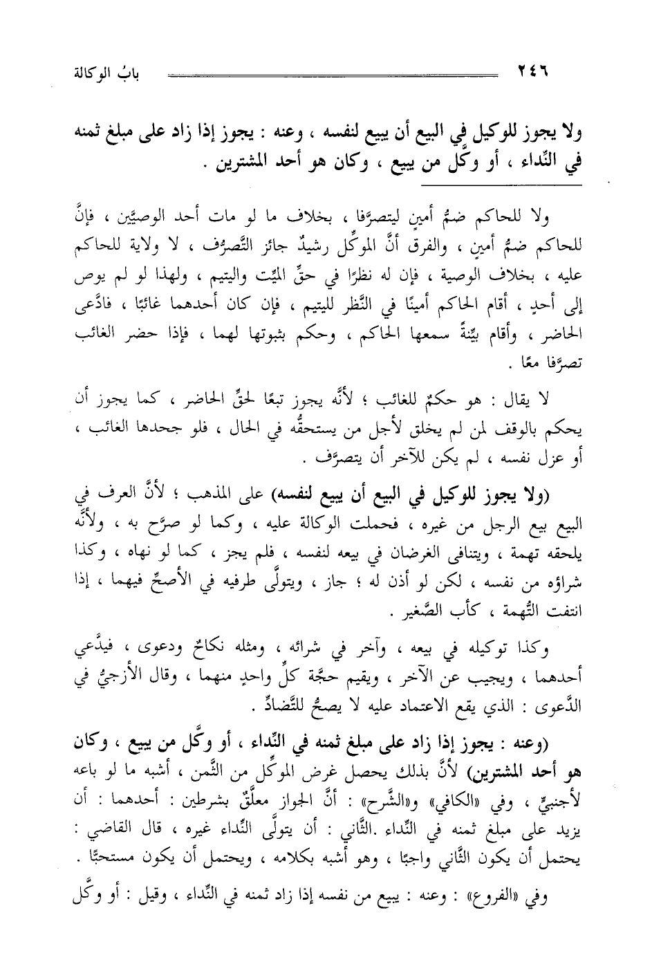 ولا يجوز للوكيل في البيع أن يبيع لنفسه وعنه: يجوز إذا زاد على مبلغ ثمنه في النداء أو وكل من يبيع وكان هو أحد المشترين.