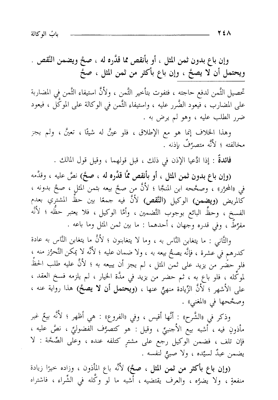 والثاني: ما يتغابن الناس به وما لا يتغابنون لأن ما يتغابن الناس به عادة كدرهم في عشرة فإنه يصح بيعه به ولا ضمان عليه لأنه لا يمكن التحرز منه فلو حضر من يزيد على ثمن المثل لم يجز أن يبيعه به لأن عليه طلب الحظ لموكله فلو باع به ثم حضر من يزيد في مدة الخيار لم يلزمه فسخ العقد على الأشهر لأن الزيادة منهي عنها "ويحتمل أن لا يصح" هذا رواية عنه وصححها في المغني