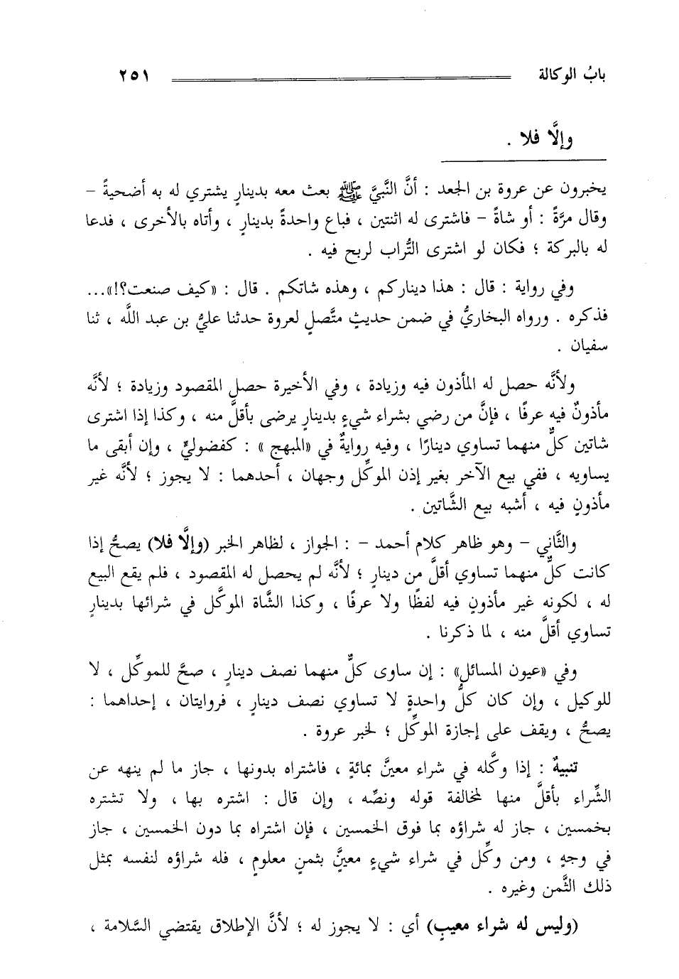 والثاني: وهو ظاهر كلام أحمد الجواز لظاهر الخبر "وإلا فلا" يصح إذا كانت كل منهما تساوي أقل من دينار لأنه لم يحصل له المقصود فلم يقع البيع له لكونه غيرمأذون فيه لفظا ولا عرفا وكذا الشاة الموكل في شرائها بدينار تساوي أقل منه لما ذكرنا