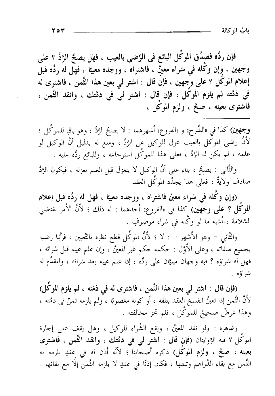 "وإن وكله في شراء معين فاشتراه ووجده معيبا فهل له رده قبل إعلام الموكل؟ على وجهين" كذا في الفروع أحدهما: له ذلك لأن الأمر يقتضي السلامة أشبه ما لو وكله في شراء موصوف