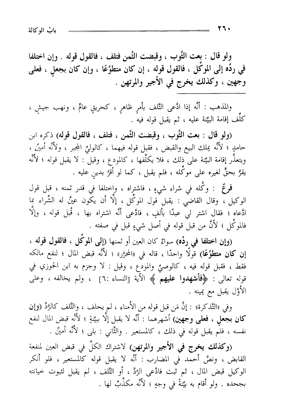 "وإن اختلفا في رده" سواء كان العين أو ثمنها "إلى الموكل فالقول قوله إن كان متطوعا" قولا واحدا قاله في المحرر لأنه قبض المال لنفع مالكه فقط فقبل قوله فيه كالوصي والمودع وقيل: لا وجزم به ابن الجوزي في قوله تعالى: {فَأَشْهِدُوا عَلَيْهِمْ} [النساء:6] الآية ولم يخالفه وعلى الأول يقبل مع يمينه