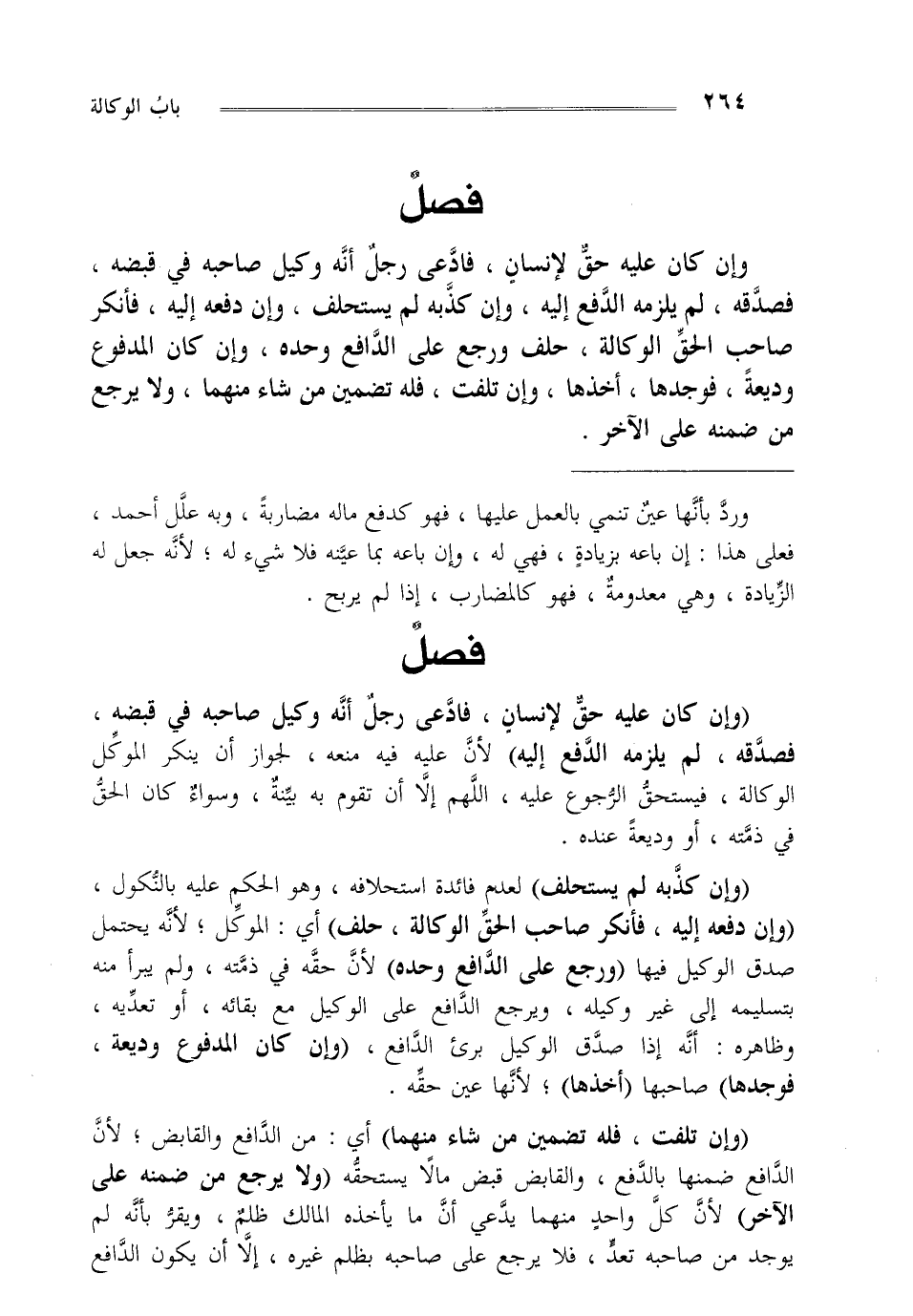 "وإن كان عليه حق لإنسان فادعى رجل أنه وكيل صاحبه في قبضه فصدقه لم يلزمه الدفع إليه" لأن عليه فيه منعه لجواز أن ينكر الموكل الوكالة فيستحق الرجوع عليه اللهم إلا أن تقوم به بينة وسواء كان الحق في ذمته أو وديعة عنده
