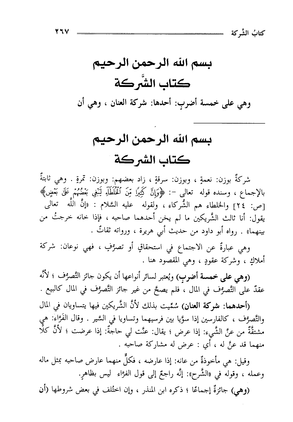 شركة بوزن نعمة وبوزن سرقة زاد بعضهم وبوزن تمرة وهي ثابتة بالإجماع وسنده قوله تعالى: {وَإِنَّ كَثِيراً مِنَ الْخُلَطَاءِ لَيَبْغِي بَعْضُهُمْ عَلَى بَعْضٍ} [ص:24] و الخلطاء هم الشركاء ولقوله عليه السلام: "إن الله تعالى يقول أنا ثالث الشريكين ما لم يخن أحدهما صاحبه فإذا خانه خرجت من بينهما" رواه أبو داود من حديث أبي هريرة ورواته ثقات