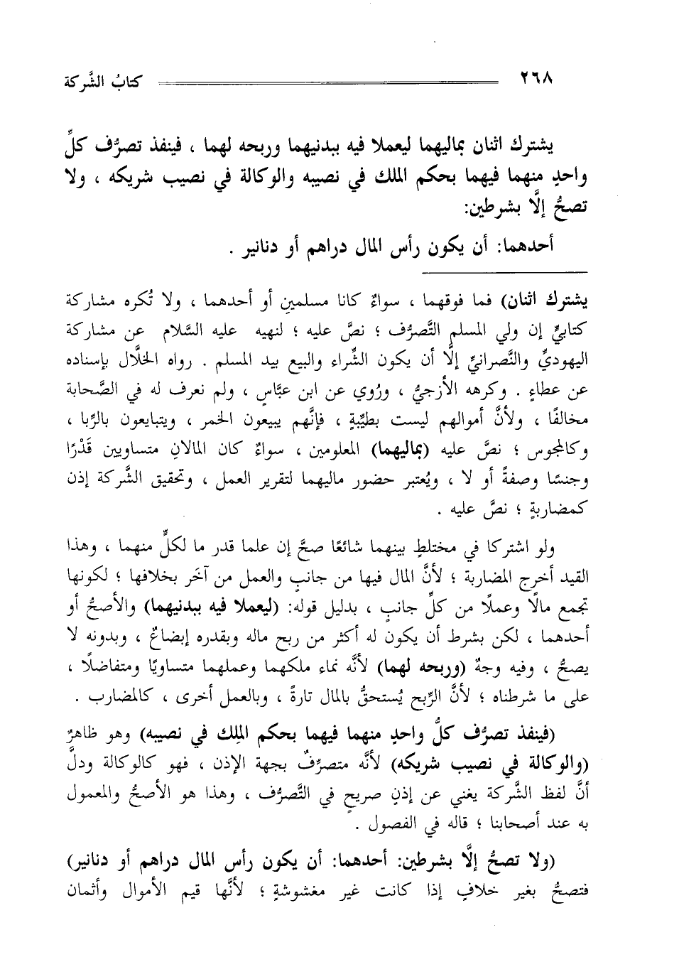 "فينفذ تصرف كل واحد منهما فيهما بحكم الملك في نصيبه" وهو ظاهر "والوكالة في نصيب شريكه" لأنه متصرف بجهة الإذن فهو كالوكالة ودل أن لفظ الشركة يغني عن إذن صريح في التصرف وهذا هو الأصح والمعمول به عند أصحابنا قاله في الفصول. "ولاتصح إلا بشرطين أحدهما: أن يكون رأس المال دراهم أو دنانير" فتصح بغير خلاف إذا كانت غيرمغشوشة لأنها قيم الأموال وأثمان