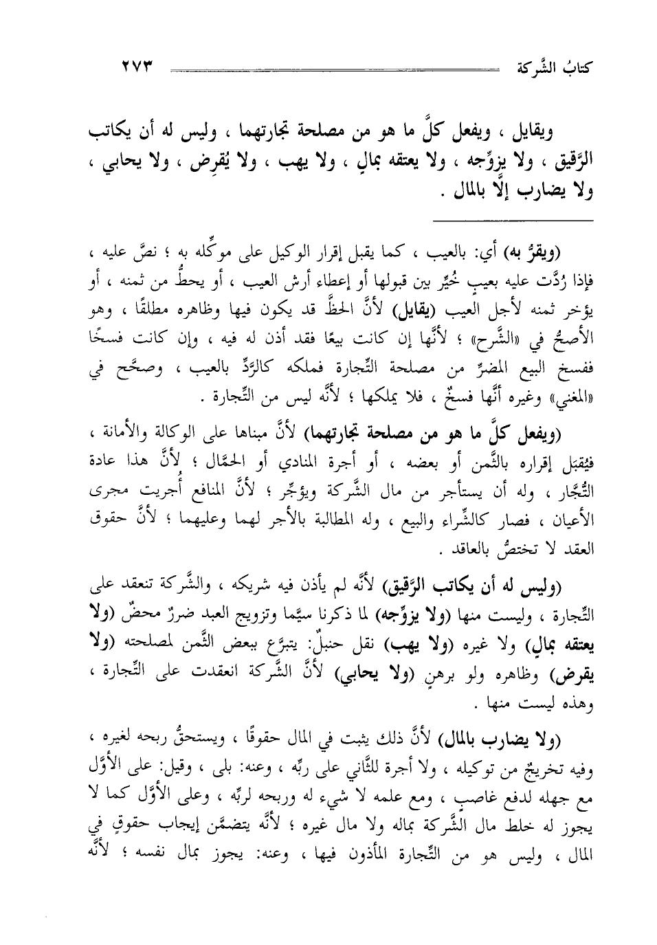 "ويفعل كل ما هو من مصلحة تجارتهما" لأن مبناها على الوكالة والأمانة فيقبل إقراره بالثمن أو بعضه أو أجرة المنادي أو الحمال لأن هذا عادة التجار وله أن يستأجر من مال الشركة ويؤجر لأن المنافع أجريت مجرى الأعيان فصار كالشراء والبيع وله المطالبة بالأجر لهما وعليهما لأن حقوق العقد لا تختص بالعاقد