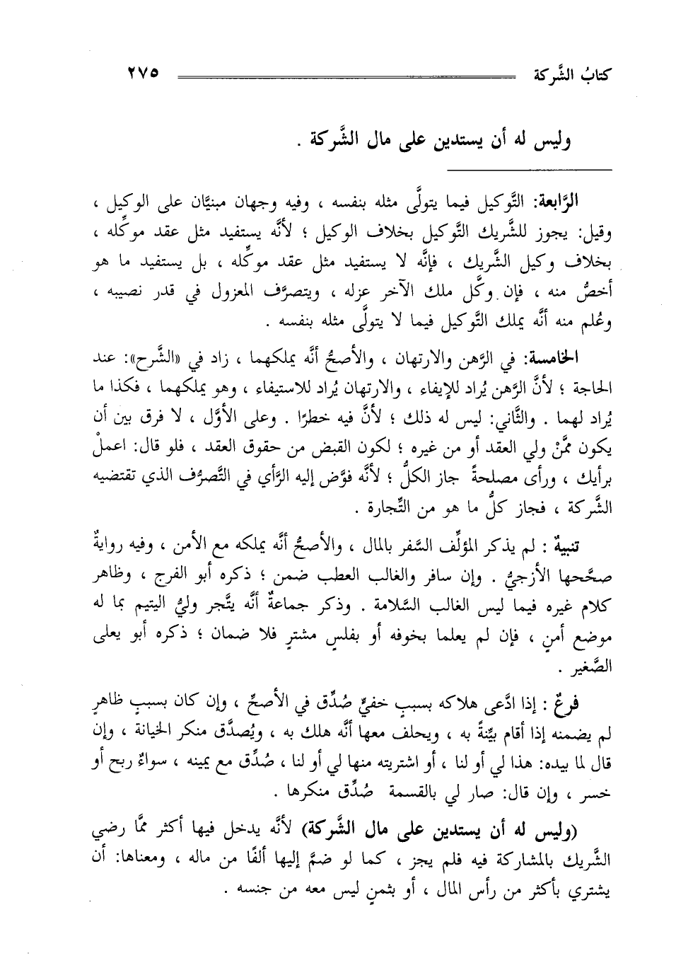 الخامسة: في الرهن والإرتهان والأصح أنه يملكهما زاد في الشرح عند الحاجة لأن الرهن يراد للإيفاء والإرتهان يراد للإستيفاء وهو يملكهما فكذا ما يراد لهما والثاني: ليس له ذلك لأن فيه خطرا وعلى الاول فرق بين أن يكون ممن ولي العقد أو من غيره لكون القبض من حقوق العقد فلو قال إعمل برأيك ورأى مصلحة جاز الكل لأنه فوض إليه الرأي في التصرف الذي تقتضيه الشركة فجاز كل ما هو من التجارة