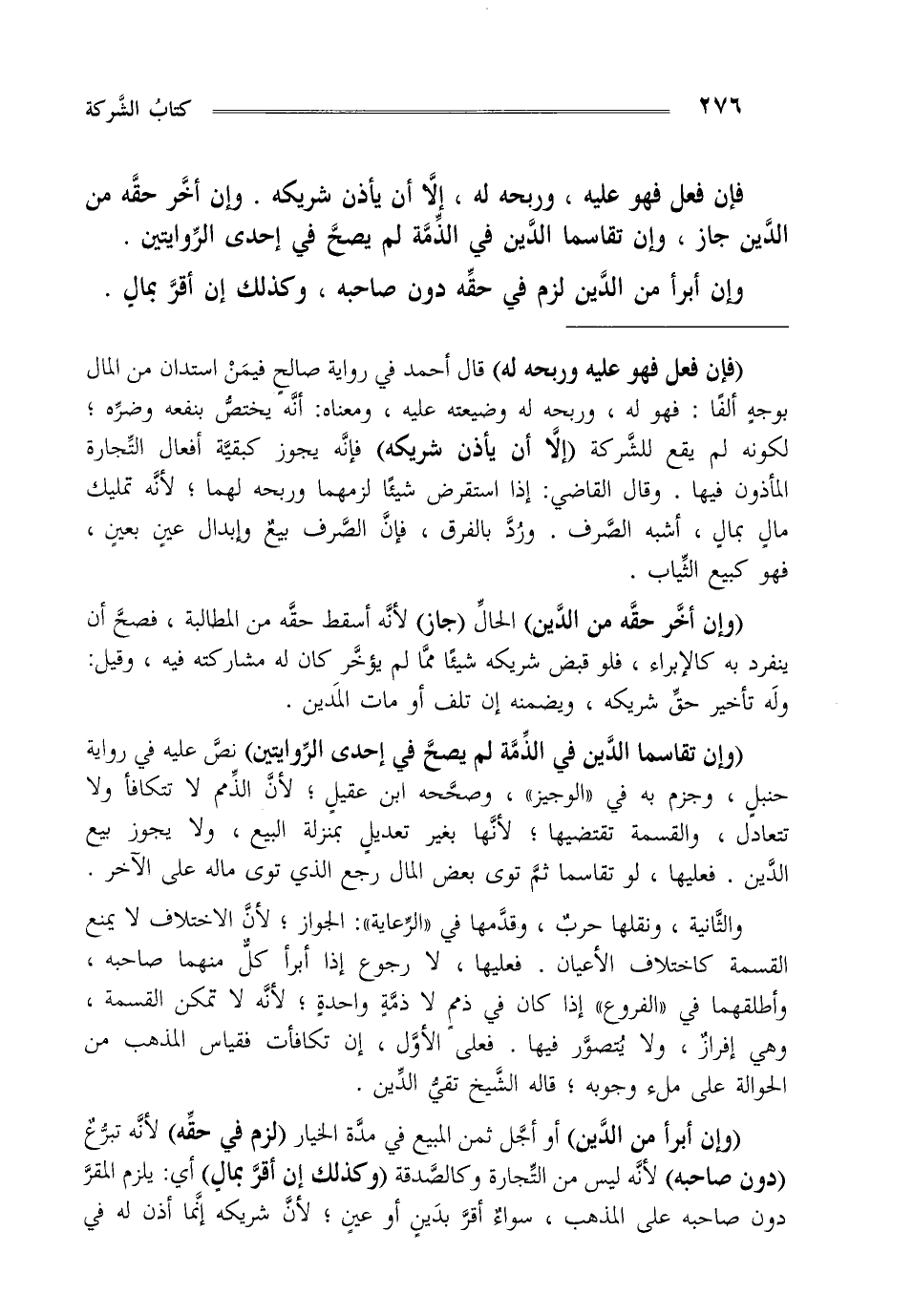 والثانية: ونقلها حرب وقدمها في الرعاية الجواز لأن الاختلاف لايمنع القسمة كاختلاف الأعيان فعليها لا رجوع إذا أبرأ كل منهما صاحبه وأطلقهما في الفروع إذا كان في ذمم لاذمة واحدة لأنه لا تمكن القسمة وهي إفراز ولا يتصور فيها فعلى الأول إن تكافأت فقياس المذهب من الحوالة على وقال القاضي: يقبل إقراره على مال الشركة مليء وجوبه قاله الشيخ تقي الدين.