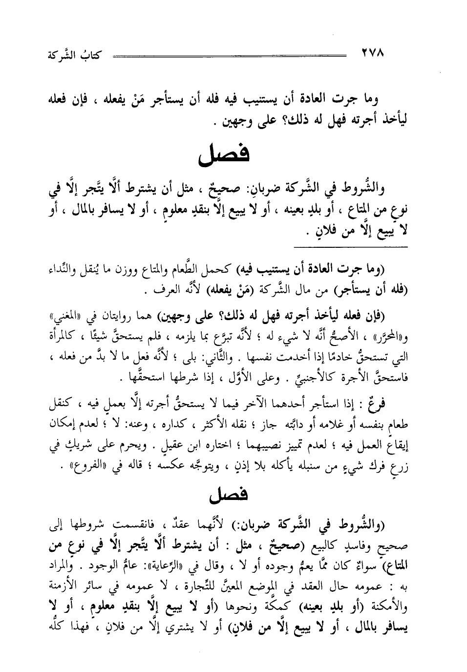 "والشروط في الشركة ضربان:" لأنهما عقد فانقسمت شروطها إلى صحيح وفاسد كالبيع "صحيح مثل: أن يشترط أن لا يتجر إلا في نوع من المتاع" سواء كان مما يعم وجوده أولا وقال في الرعاية عام الوجود والمراد به عمومه حال العقد في الموضع المعين للتجارة لا عمومه في سائر الازمنة والامكنة "أو بلد بعينه" كمكة ونحوها "أو لا يبيع إلا بنقد معلوم أو لا يسافر بالمال أو لايبيع إلا من فلان" أو لا يشتري إلا من فلان فهذا كله