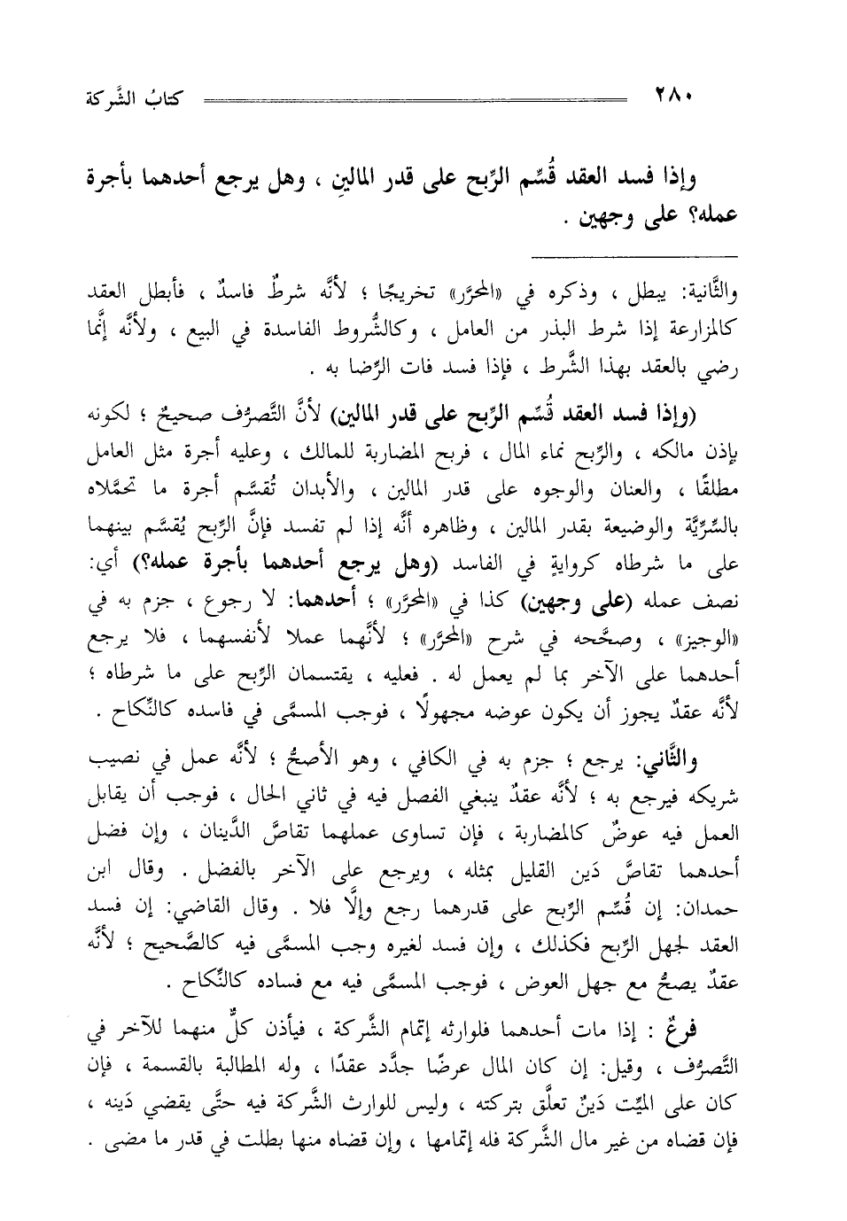 والثاني: يرجع جزم به في الكافي وهو الأصح لأنه عمل في نصيب شريكه فيرجع به لأنه عقد ينبغي الفصل فيه في ثاني الحال فوجب أن يقابل العمل فيه عوض كالمضاربة فإن تساوى عملهما تقاص الدينان وإن فضل أحدهما تقاص دين القليل بمثله ويرجع على الآخر بالفضل وقال ابن حمدان إن قسم الربح على قدرهما رجع و إلا فلا وقال القاضي: إن فسد العقد لجهل الربح فكذلك وإن فسد لغيره وجب المسمى فيه كالصحيح لأنه عقد يصح مع جهل العوض فوجب المسمى فيه مع فساده كالنكاح